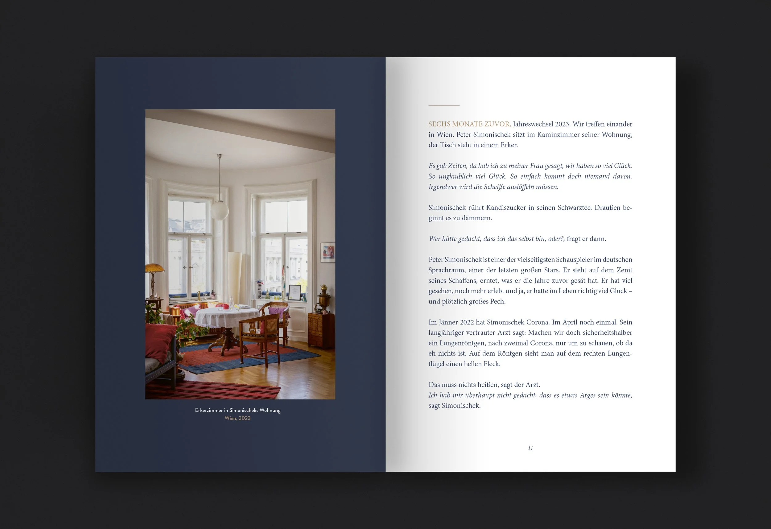 »Peter Simonischek ist einer der vielseitigsten Schauspieler im deutschen Sprachraum, einer der letzten großen Stars. Burgschauspieler, Filmstar, Lebemann. Und dann ist plötzlich alles anders: Eine Diagnose zwingt ihn zur Auseinandersetzung mit seinem Leben und dem Tod. Gemeinsam mit der Autorin Saskia Jungnikl-Gossy stellt Peter Simonischek seine Lebensthemen auf den Prüfstand.«